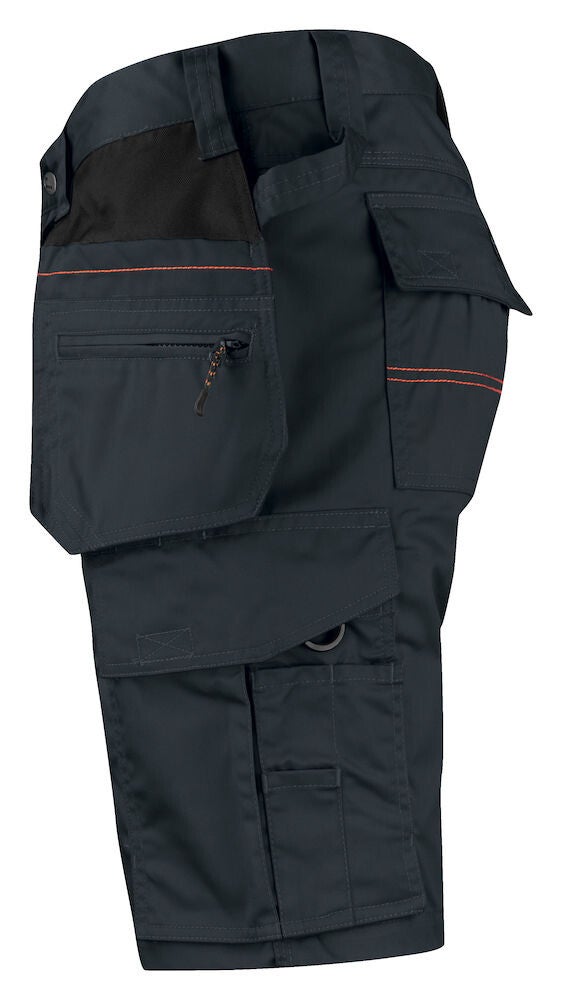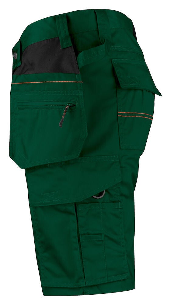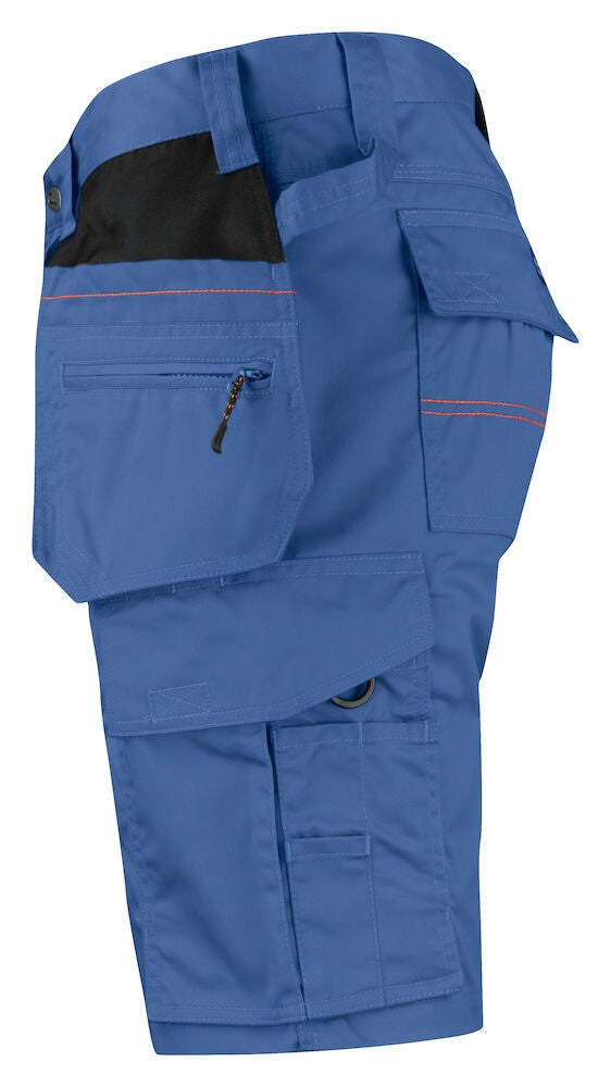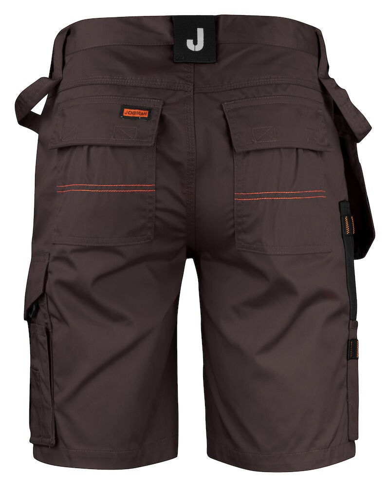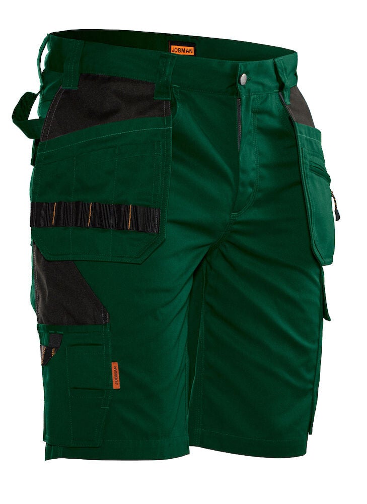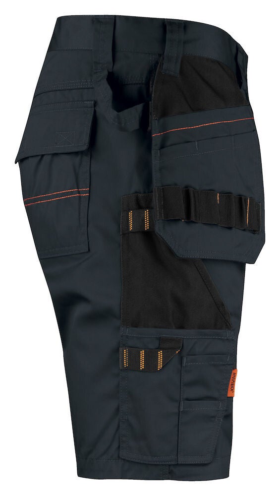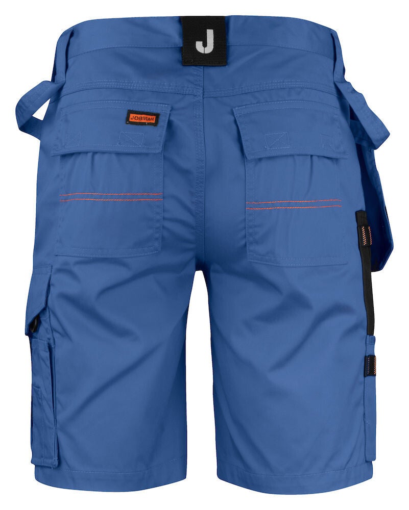 Praktische korte werkbroek gemaakt van easy-care polyester/katoen. De broek is voorzien van diverse zakken waaronder, verstevigde holsterzakken met extra compartimenten, achterzakken met klep en klittenbandsluiting, zak op het been met compartimenten en klep met klittenbandsluiting en een duimstokzak met ruimte voor een mes. De broek is leverbaar in maar liefst 8 commerciële kleuren met zwarte details die mooi aansluiten op de Jobman Practical lijn.