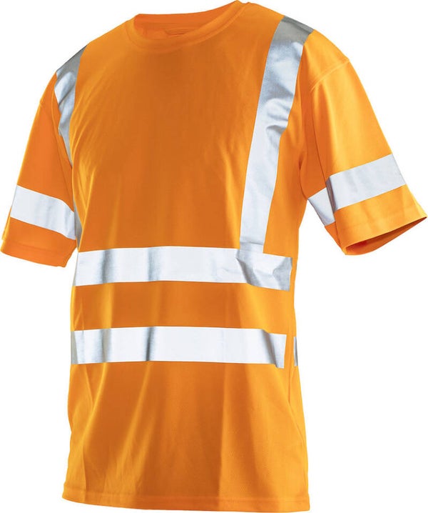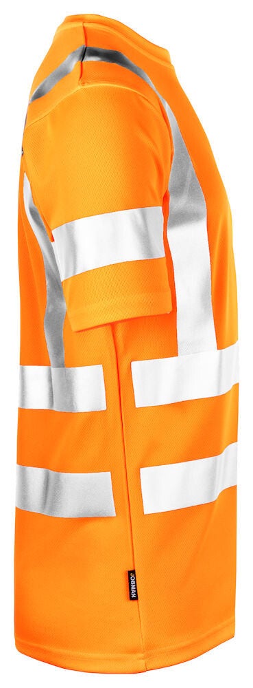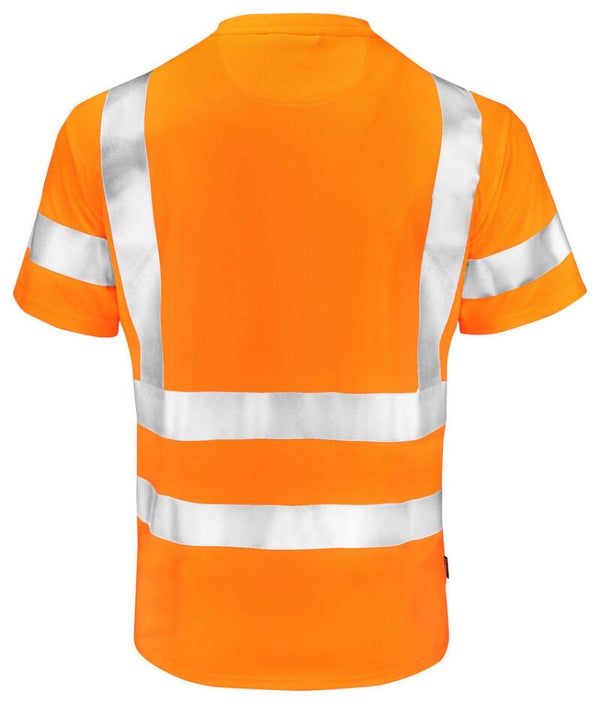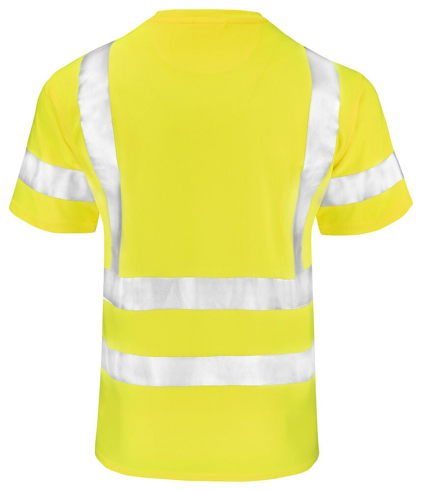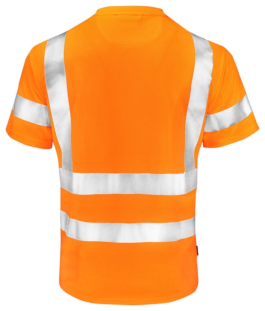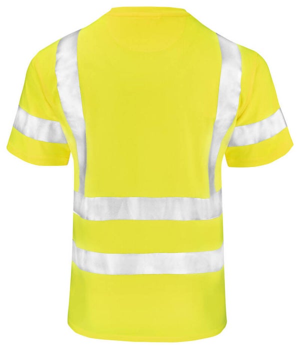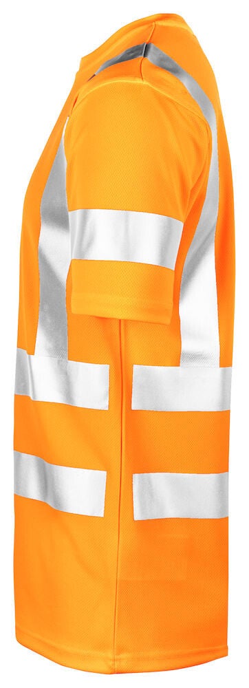 Praktisch Hi-Vis T-shirt gemaakt van polyester met een vochtafvoerende werking voor een aangenaam droog gevoel gedurende de dag. Het T-shirt is afgewerkt met naadloze reflecterende strepen met onderbreking op de zijnaden voor optimale bewegingsvrijheid. De reflecterende strepen op de schouders zorgen voor extra zichtbaarheid van bovenaf.