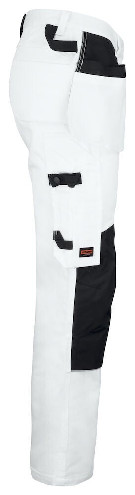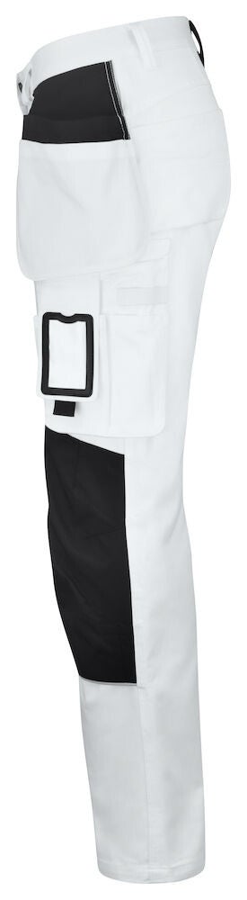 Technische dames werkbroek speciaal ontwikkeld voor schilders. De broek heeft een uitstekende pasvorm. De nauw geweven katoenen twill zorgt ervoor dat het pigment van de verf zo min mogelijk wordt opgenomen door de broek. De broek is voorzien van ruime holsterzakken gevoerd met waterafstotend FA™ polyamide. Verder is de broek uitgerust met ruime steekzakken aan de voor- en achterzijde, zak op het been met extra compartiment, rits, ruimte voor een telefoon en ID-kaart en handige zak voor het opbergen van een mes, duimstok en andere verfbenodigdheden. Wasbaar op 85°C. Kniestukken kunnen op twee hoogtes geplaatst worden voor optimale bescherming.